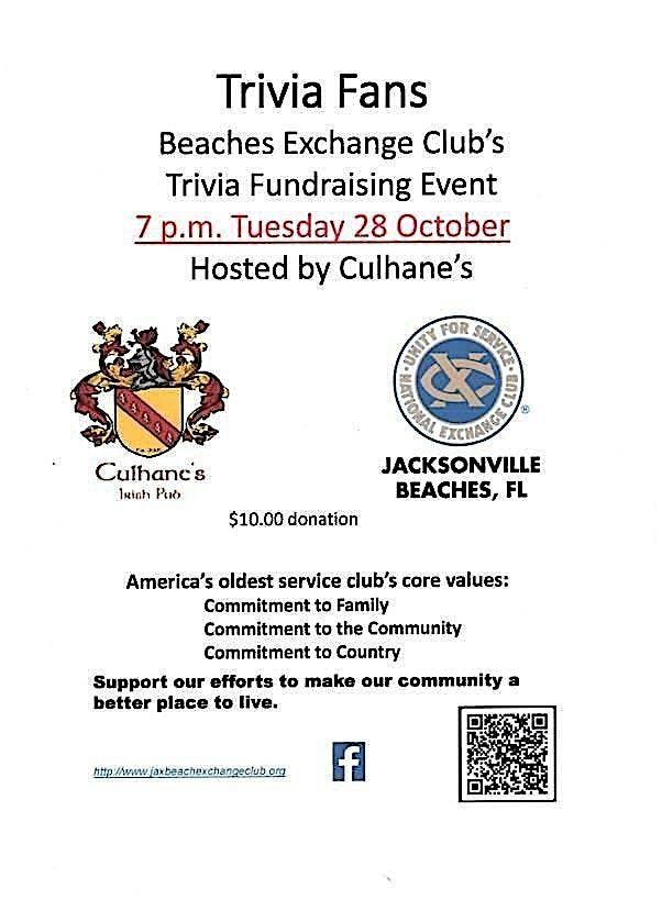 The Jacksonville Beach Exchange Club is partnering once again with Culhane's Irish Pub (Atlantic Beach) for a Trivia Giving Back FUNraising Event that will benefit so many at the Beaches.