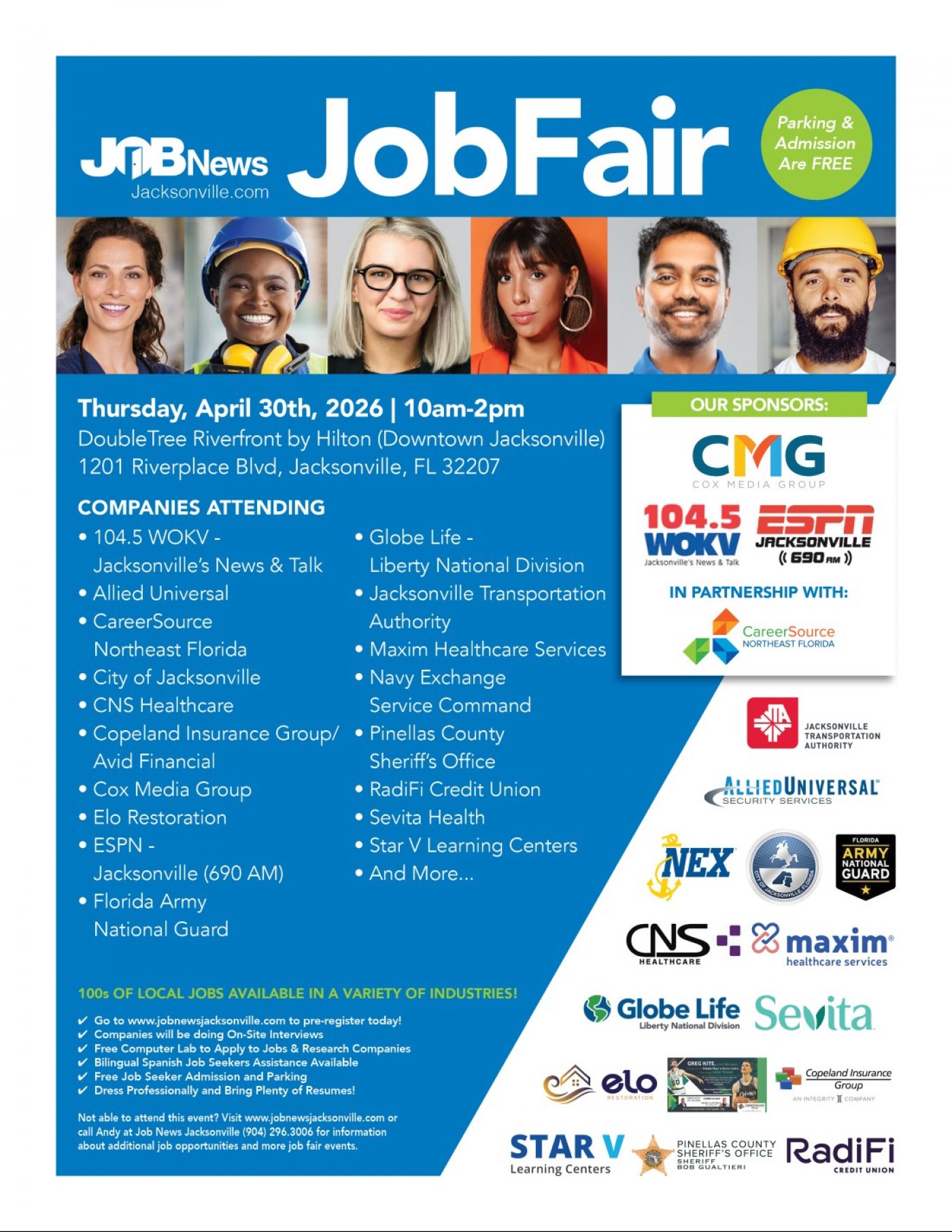 Job News Jacksonville, along with our Sponsor - Cox Media Group, and In Partnership with CareerSource Northeast Florida, will be hosting a Hiring Event from 10 am to 2 pm on Thursday April 30th at The DoubleTree Riverfront Hotel located at 1201 Riverplace Blvd in Downtown Jacksonville.