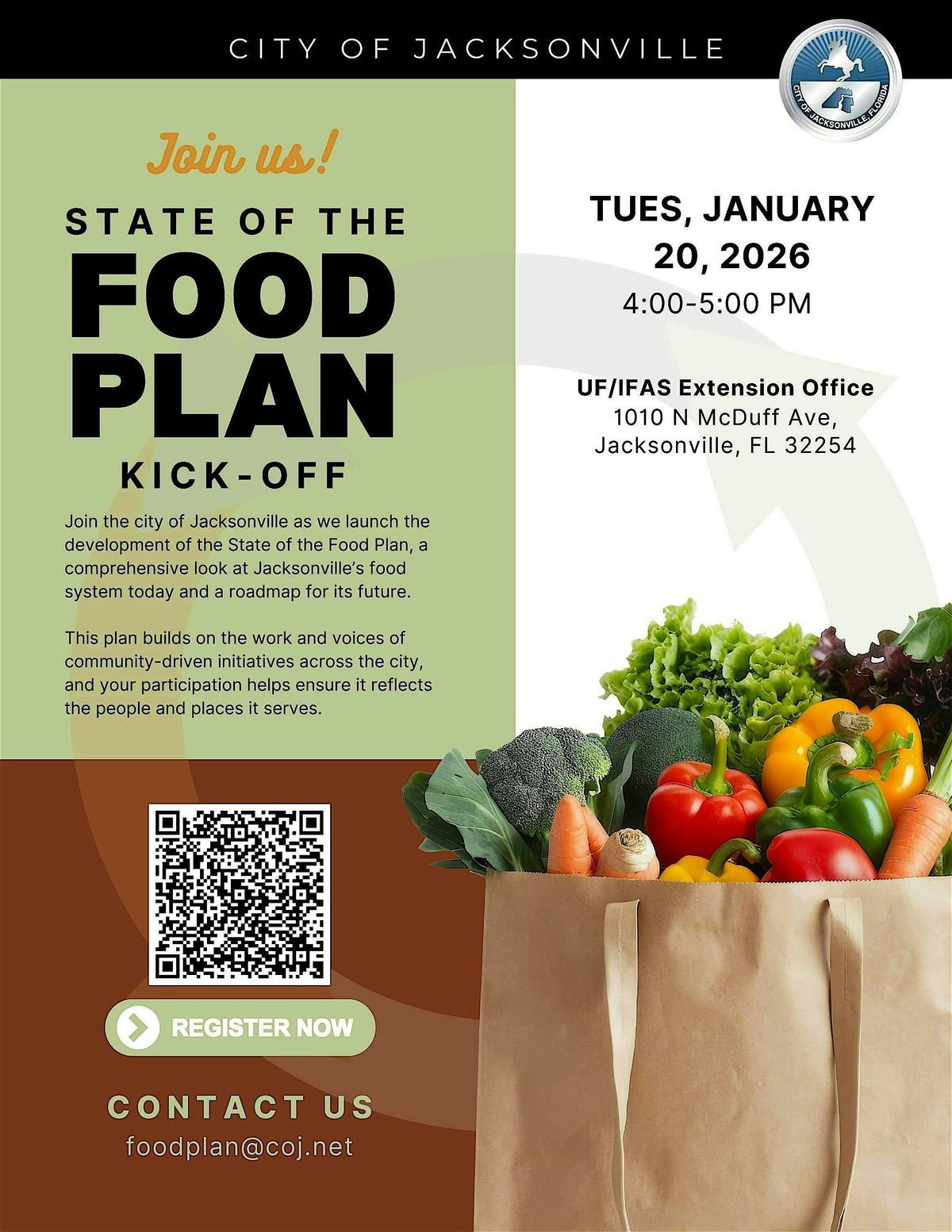 The Food Plan will serve as a guiding framework to align policies, programs, and investments that support a resilient, equitable, and sustainable food system for Jacksonville.