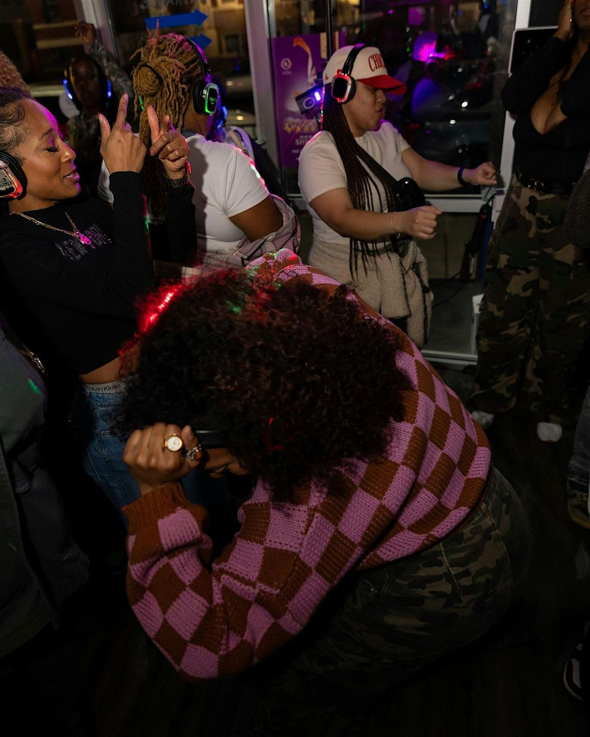 When you arrive you’ll receive a pair of wireless headphones. You can adjust the volume and choose between up to three DJ’s with a flip of a switch. Each headset has a color (BLUE, RED, GREEN) LED that shows what channel you are listening to, so you can dance along with those listening to the same DJ. It’s super social; just lower the volume or take the headphones off to talk to that girl or guy. There’s no loud music that you have to talk over. Plus, there’s no ringing in your ears when you leave!