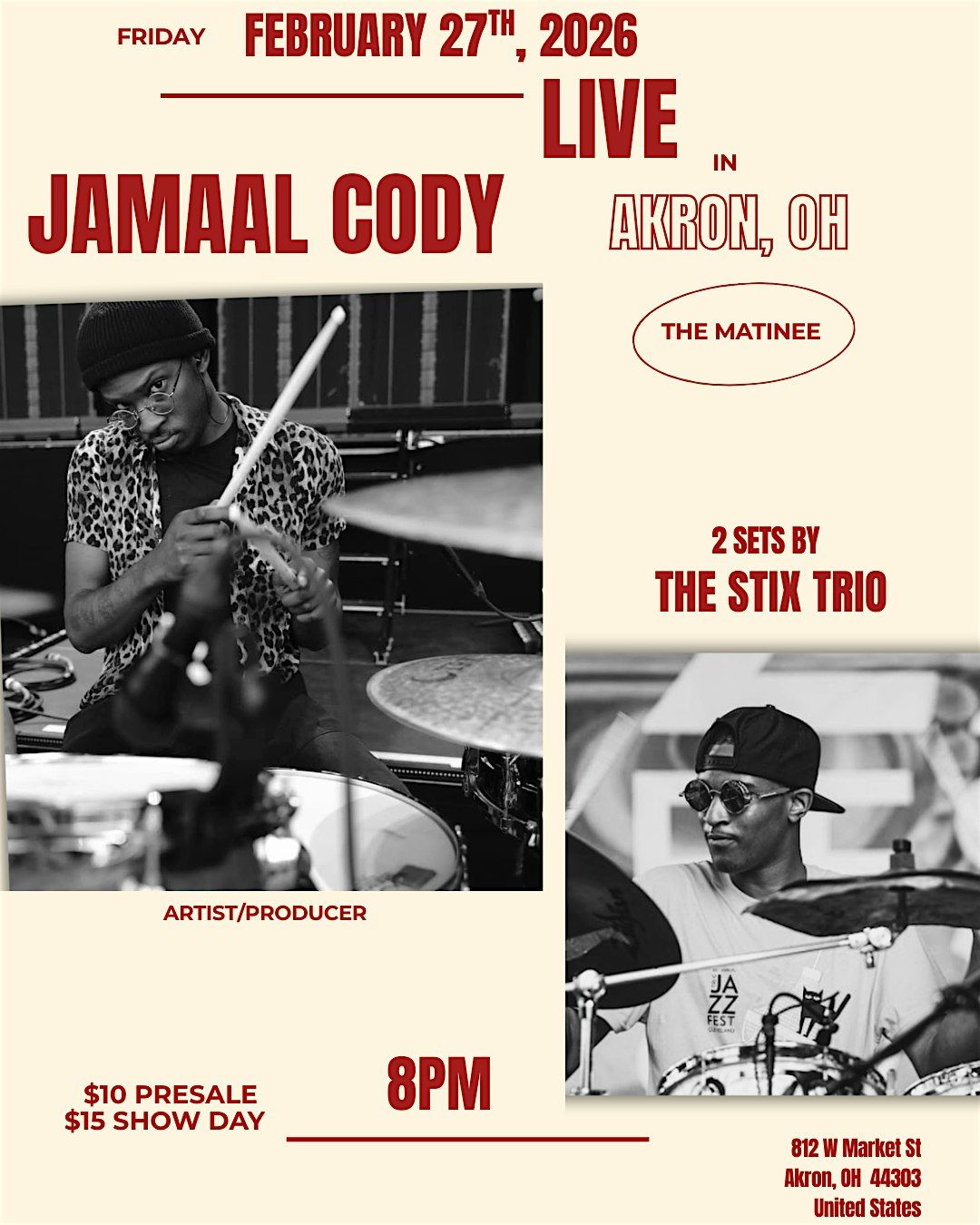 Jamaal Cody composes 95% of his music himself. He's a drummer, producer, and artist who's been building a following across Ohio with his original work and live performances. His shows combine technical skill with the kind of energy that makes you remember why you showed up in the first place.