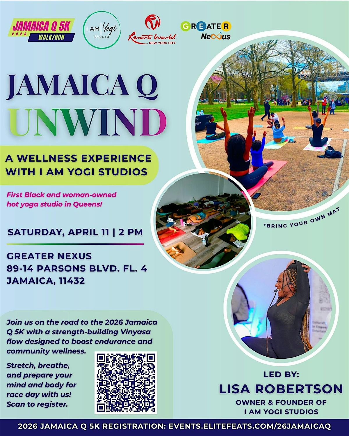 Join us in person at Greater nexus for Jamaica Q Unwind, a wellness event in collaboration with I Am Yogi Studios as part of the journey toward the Jamaica Q 5K.