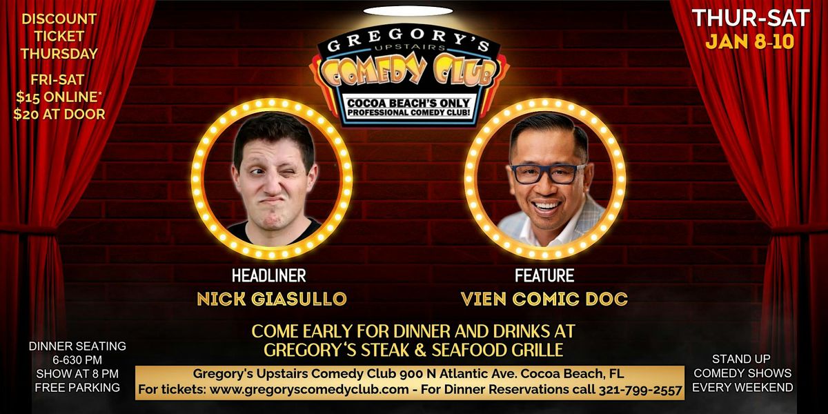 Come see the best touring comedians from all over the country performing every weekend at Gregory's Comedy Club. Enjoy upscale dining with the best local staff Cocoa Beach has to offer! Seating starts 2 hours prior to showtimes. This week nationally touring comedian Nick Giasullo (Youtube Special Higher Education) headlines. His fun, friendly and sharp styles of comedy have been a hit all over the country! Featuring nationally touring Comedian Vien The Comic Doc featuring!