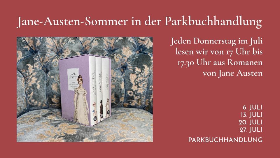 Jeden Donnerstag im Juli lesen wir von 17 Uhr bis 17.30 Uhr aus unseren Lieblingswerken von Jane Austen.Im Februar 2024 dürfen wir uns auf eine spannende Veranstaltung über Jane Austen mit Denis Scheck und dem Trio Solaris freuen. Als Vorbereitung darauf laden wir im Juli zum Jane-Austen-Sommer ein. Jeweils Donnerstags ab 17 Uhr liest unsere Buchhändlerin Laura, die großer Jane-Austen-Fan ist, im historischen Kostüm Lieblingspassagen aus Stolz und Vorurteil, Verstand und Gefühl und Emma.