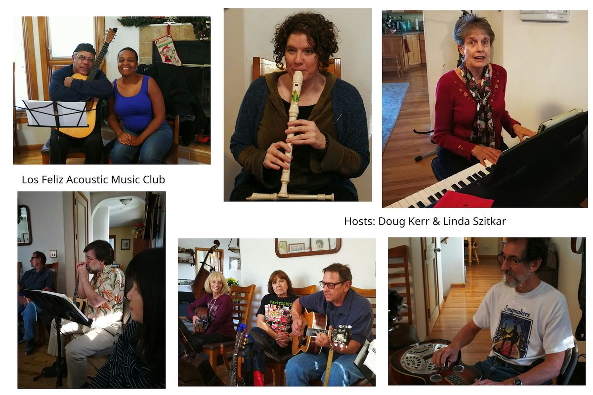 We are the Los Feliz Acoustic Music Club. Bring your voice and/or your instrument and make music with us. Approximately 12 people taking turns selecting a song to play and sing together. You can visit our website, https://sites.google.com/view/los-feliz-acoustic-music-club/home or our Facebook page, https://www.facebook.com/groups/1062046392565846