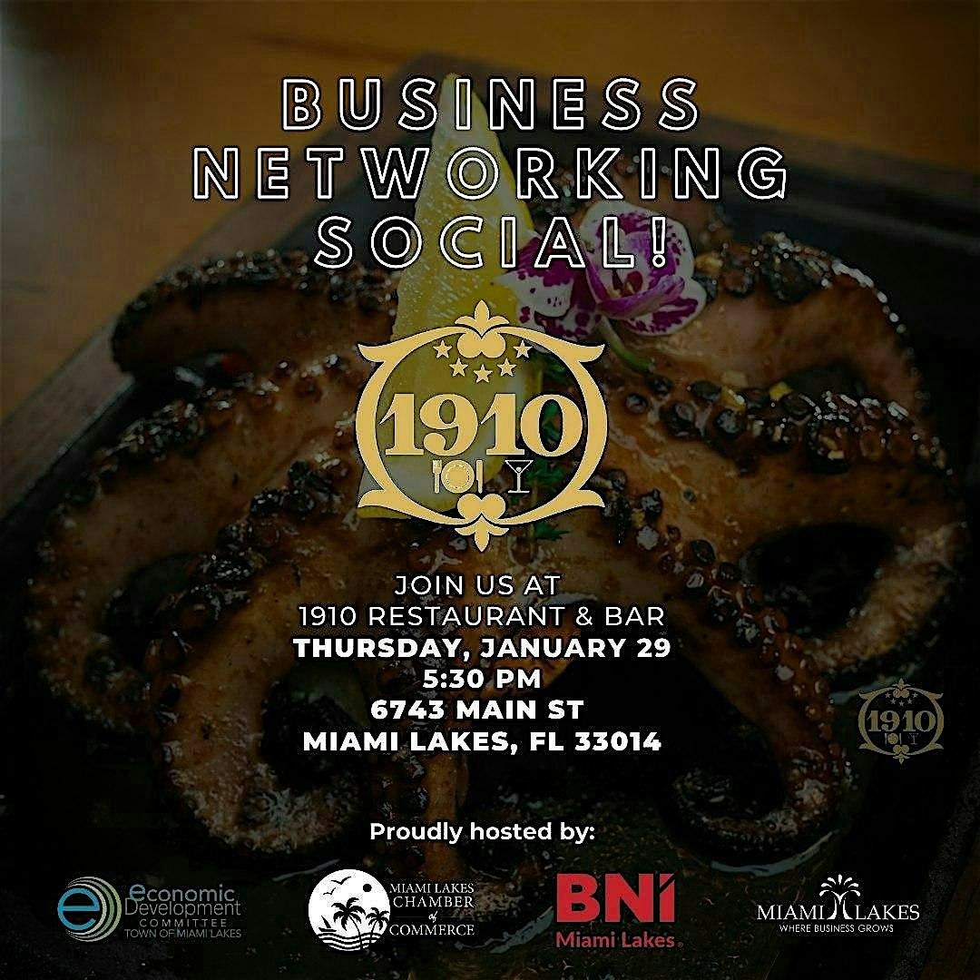 Join us on Thursday January 29th, 2026 at 5:30 PM at 1910 Restaurant & Bar Miami Lakes for an evening of networking and socializing with like-minded professionals.
