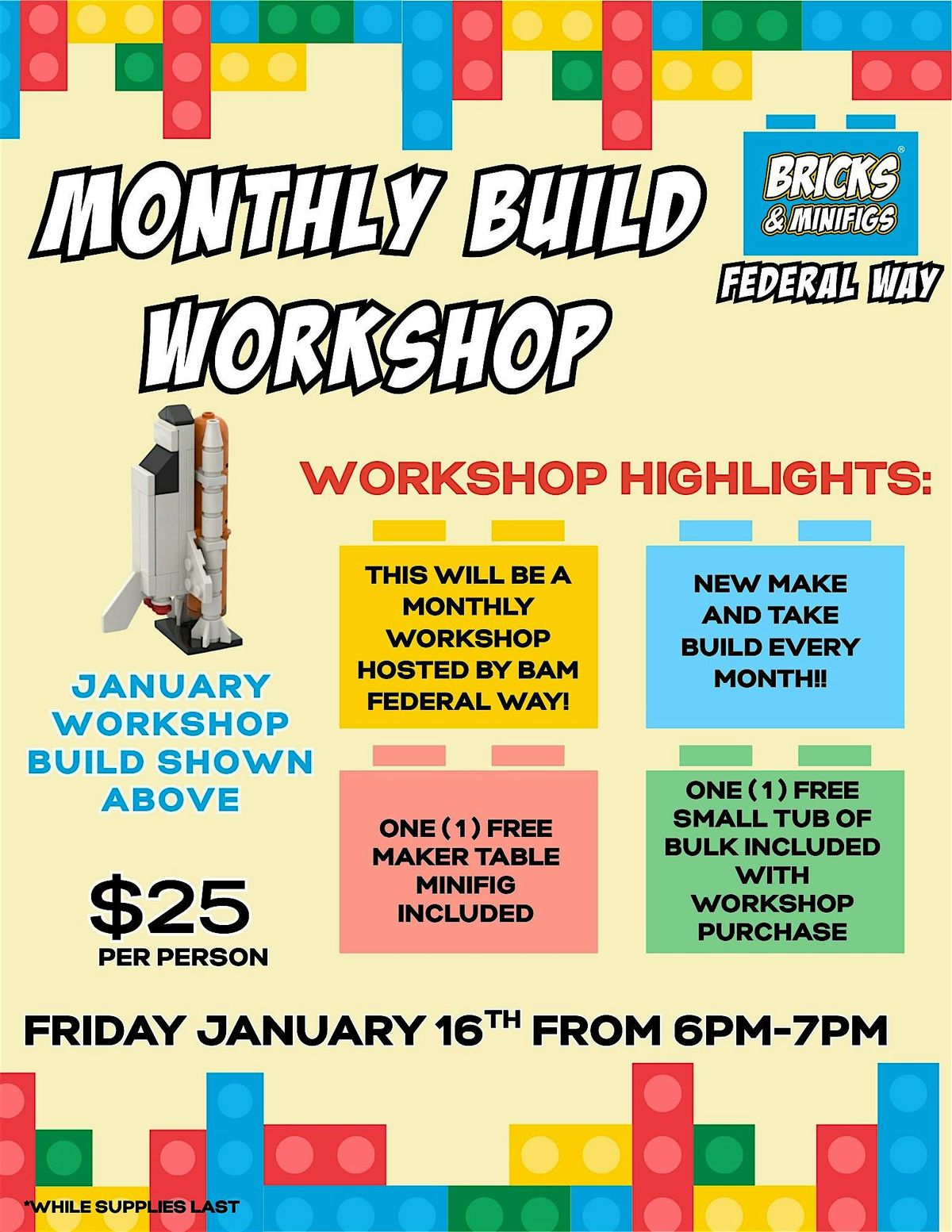 This is a monthly make and take workshop held at BAM Federal Way. The January build is a rocketship! Blast off into the new year and build with us on January 16th from 6-7pm. Each ticket includes the monthly built kit and instructions. We will build this together in our party room! To keep the building going at home, everyone will also be able to take home a small tub of bulk, as well as a minifig from our minifig make table! Come down, hang out with other builders, get to know our LEGO community and have a great time building with us!