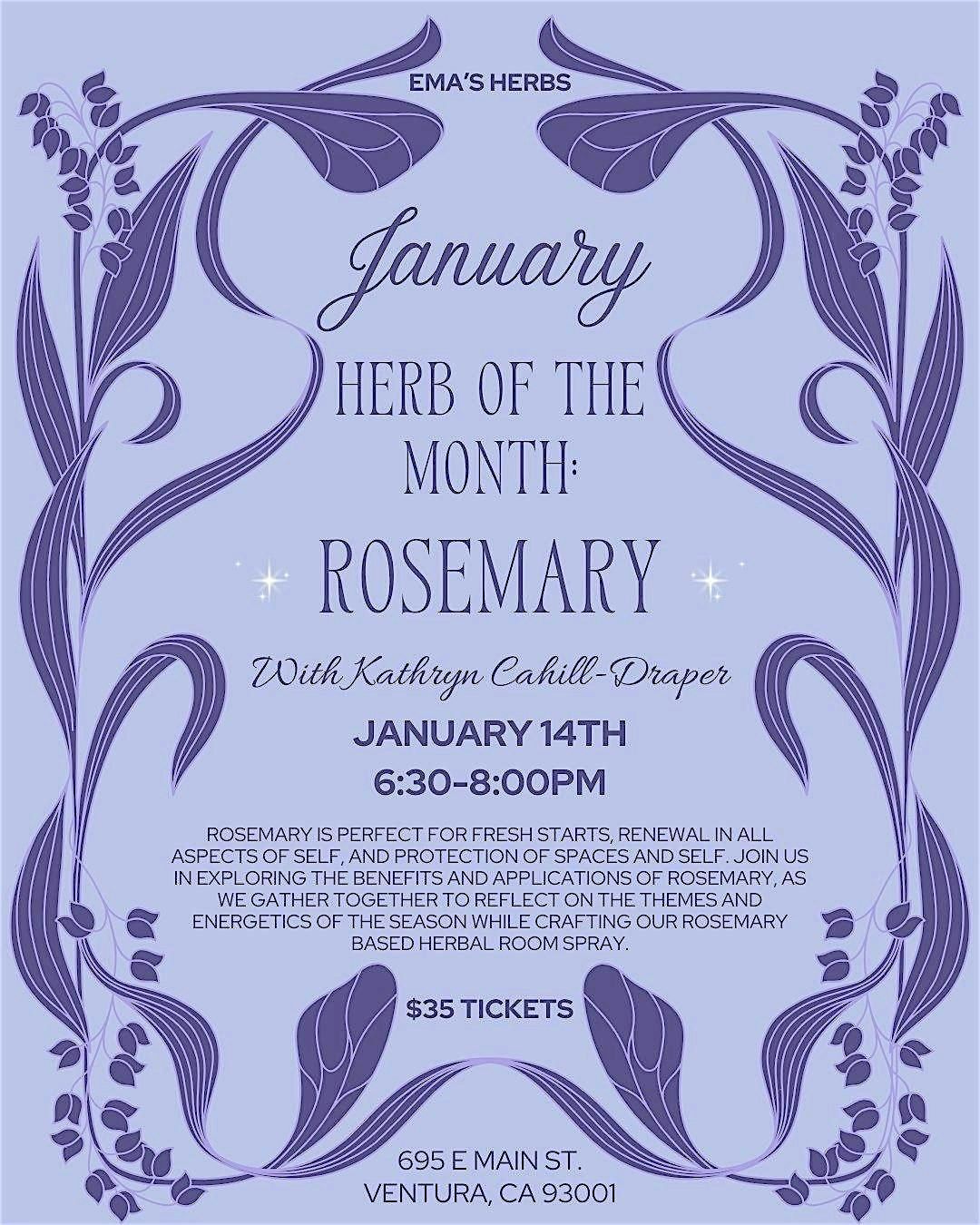 Rosemary: Representative of Capricorn's wisdom and resilience. Aids memory, focus, and clarity of heart and mind. Honors the determination of the goat by aiding mental and emotional stamina, while simultaneously encouraging inner grounding and warding off negative energies. Rosemary is perfect for fresh starts, renewal in all aspects of self, and protection of spaces and self. Join herbalist and green witch Kathryn Cahill-Draper in exploring the benefits and applications of Rosemary, as we join together to reflect on the themes and energetics of the season while crafting our Rosemary based herbal room spray!