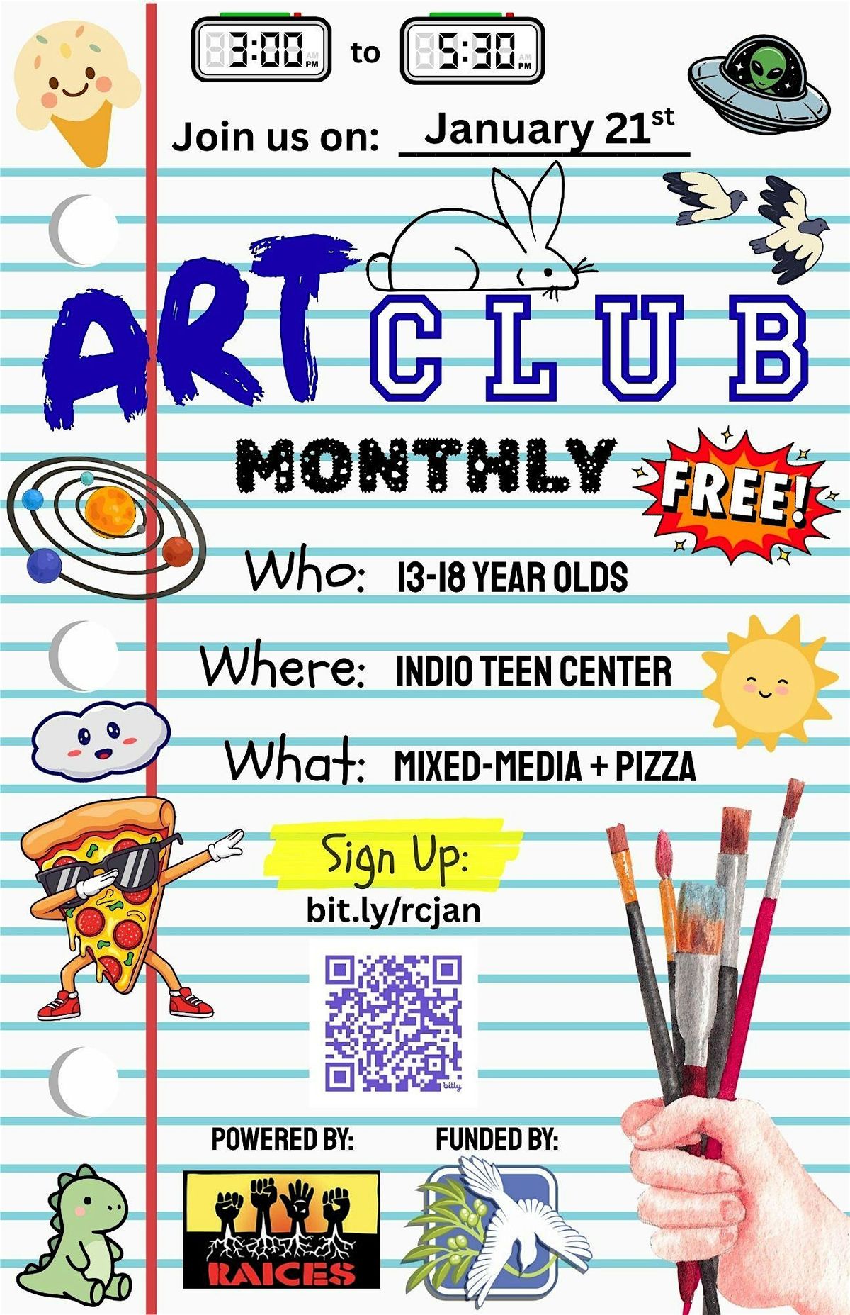 Sign up for this free art club with monthly meetings across the Coachella Valley. Make new friends and learn advanced art techniques during each meeting which lasts 2 to 3 hours. This club is open to beginners, intermediates, and advanced youth artists. Our friendly staff are also artists and look forward to supporting you on your creative journey. We offer light refreshments including pizza at each Art Club meeting!