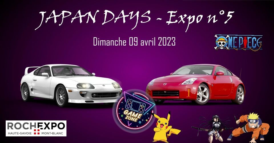 Nous sommes heureux de vous retrouver le dimanche 09 avril 2023 au Parc des Expositions de ROCHEXPO (74) pour la 5ème édition de la JAPAN DAYS Expo.A cette occasion, venez admirez et contemplez + de 400 véhicules (autos, motos et 4x4) japonais ! En 2023, fêtons ensemble les 20 ans de la Nissan 350z ainsi que les 30 ans de la Toyota Supra MK4.