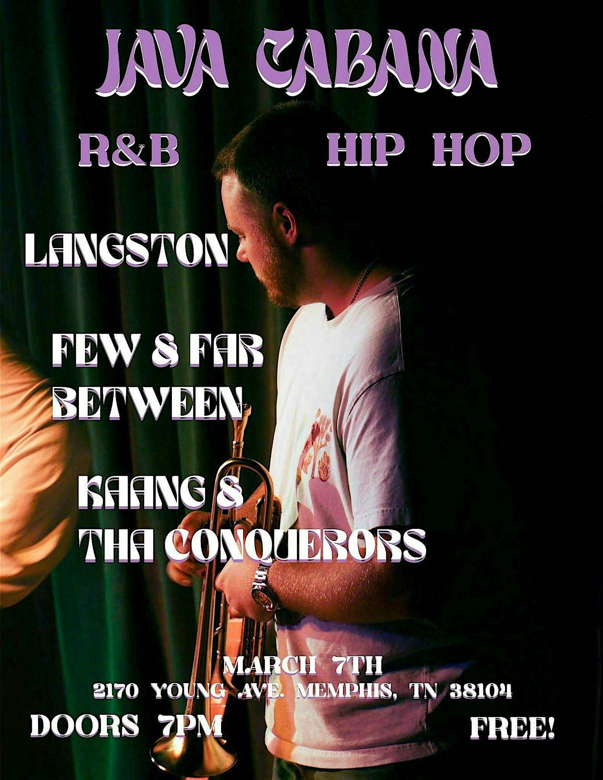 Get ready for an unforgettable night at the Java Cabana R&B/HipHop Show! Our show will have Langston, KAANG and tha Conquerors, and Few&FarBetween, three amazing Memphis based artist and groups.