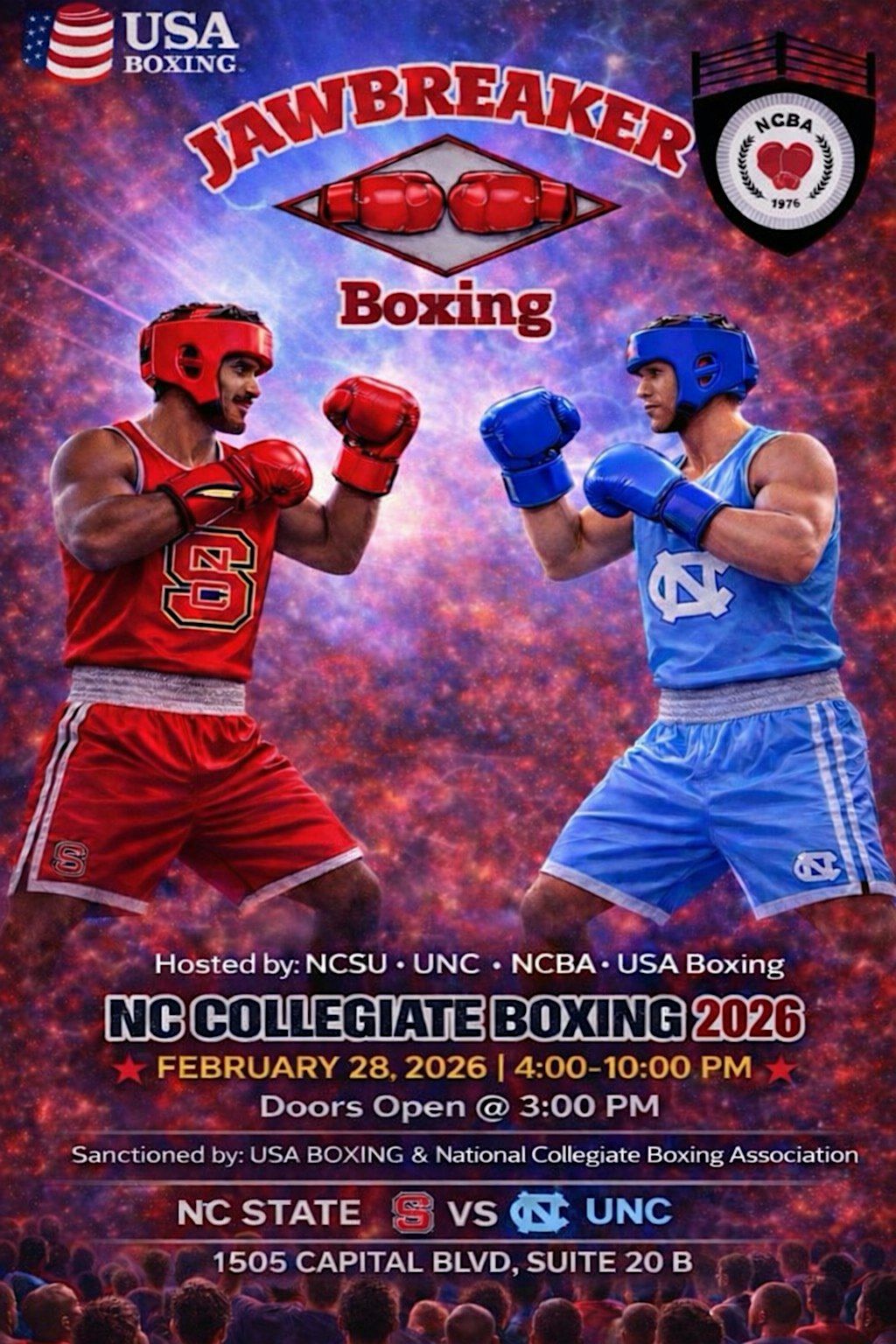 #NCColligateBoxing #FightNightNC #JawbreakerBoxing #CollegeBoxing #USABoxing #NCStateVsUNC #LiveBoxing #BoxingEvent #AmateurBoxing #SupportLocalFighters #TriangleEvents #RaleighEvents #BoxingCommunity #FutureChampions