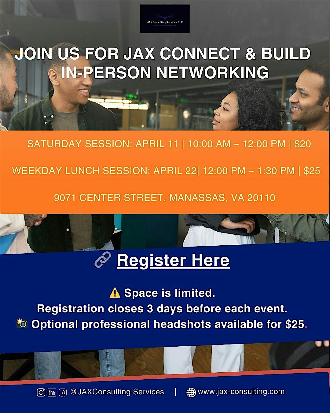 Saturday Connect & Collaborate is a relaxed, coffee-style networking experience designed for entrepreneurs and small business owners who want genuine connection and real synergy. This session focuses on relationship building, open conversation, and expanding your circle in a welcoming, low-pressure environment. Expect intentional networking, meaningful introductions, and a short spotlight segment to spark practical insight and collaboration. Light refreshments will be provided during the event. Optional professional headshots will also be available for $25 with our on-site photographer for those who would like to update their professional photos. Attendance is limited to maintain a curated and conversational environment.Get ready to mix, mingle, and grow your network at the JAX Business Connect Series! This in-person event is the perfect spot to meet local pros, spark new ideas, and boost your business vibes. Whether you're looking to collaborate or just chat with fellow entrepreneurs, we've got you covered. Don't miss out on the chance to connect face-to-face and take your biz game to the next level!