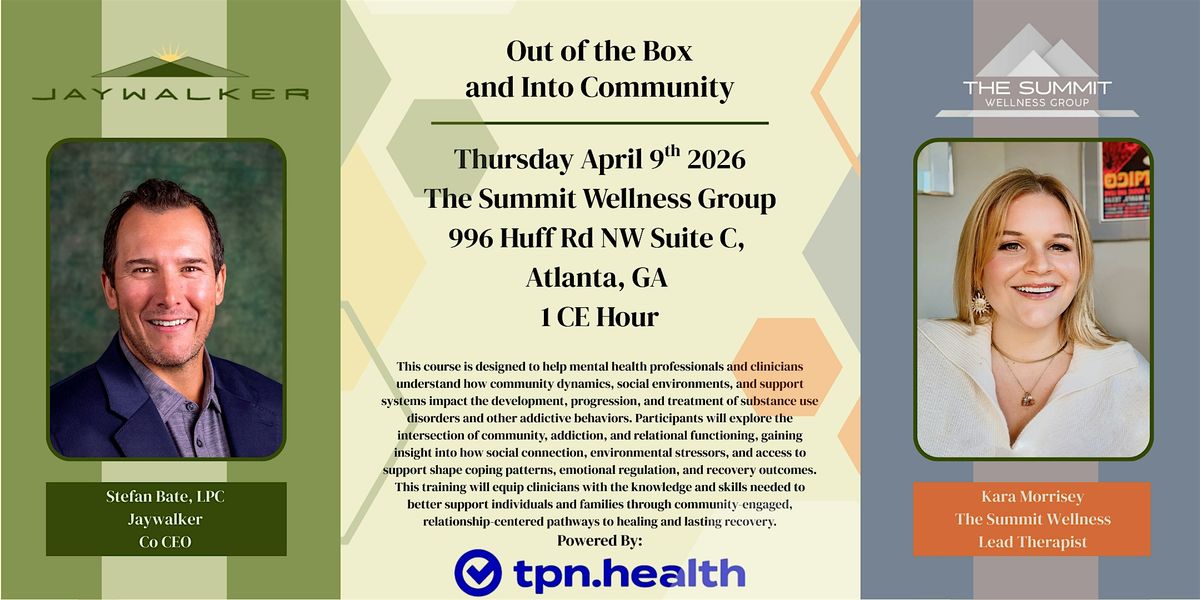 Join Jaywalker’s Co CEO Stefan Bate, LPC, and The Summit Wellness Group's Lead Therapist Kara Morrisey for his in person and live streamed CEU Event.