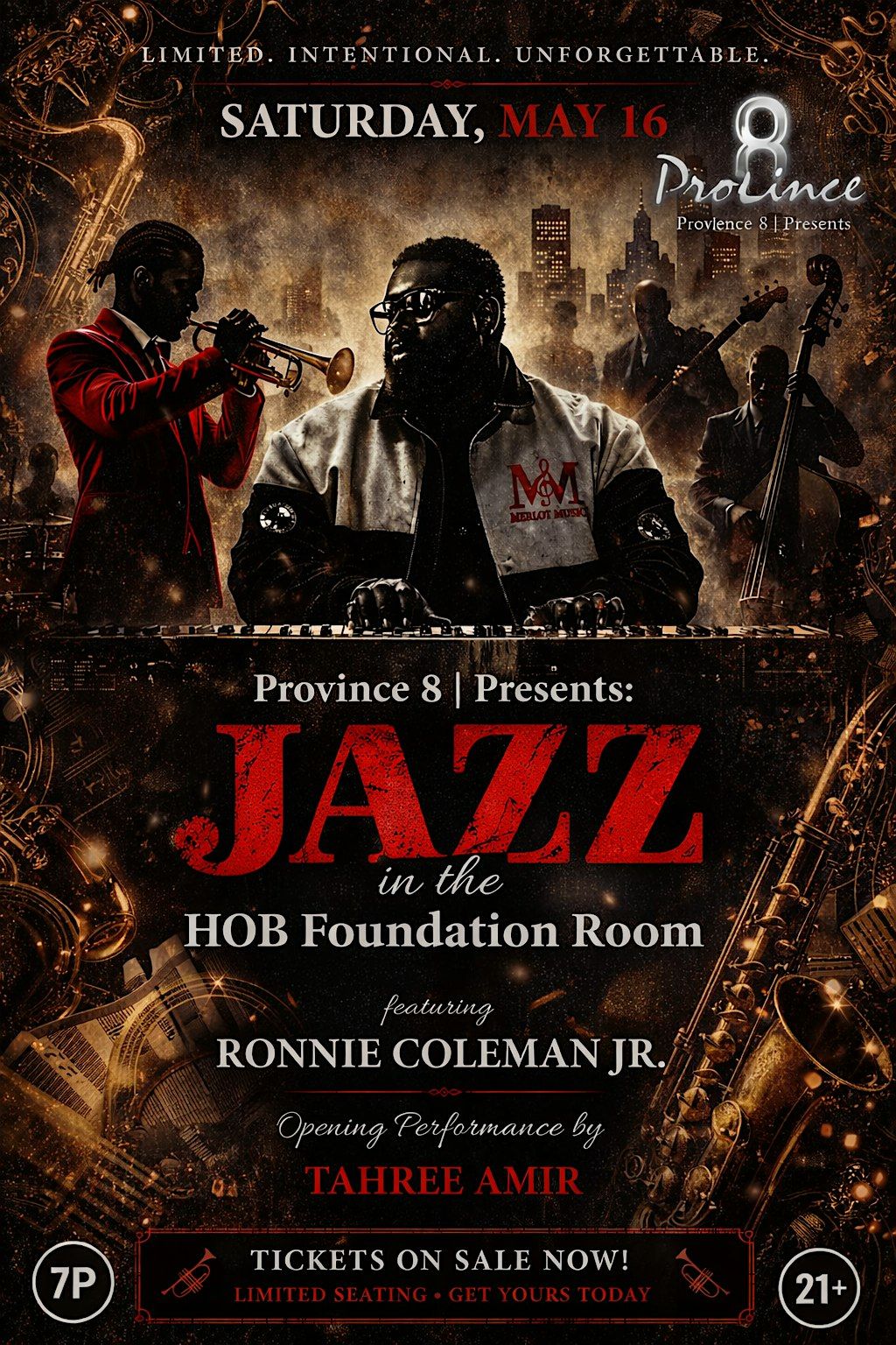 Province 8 | Presents Jazz in the Foundation Room. Join us as we continue our Jazz Concert Series Featuring Ronnie Coleman Jr