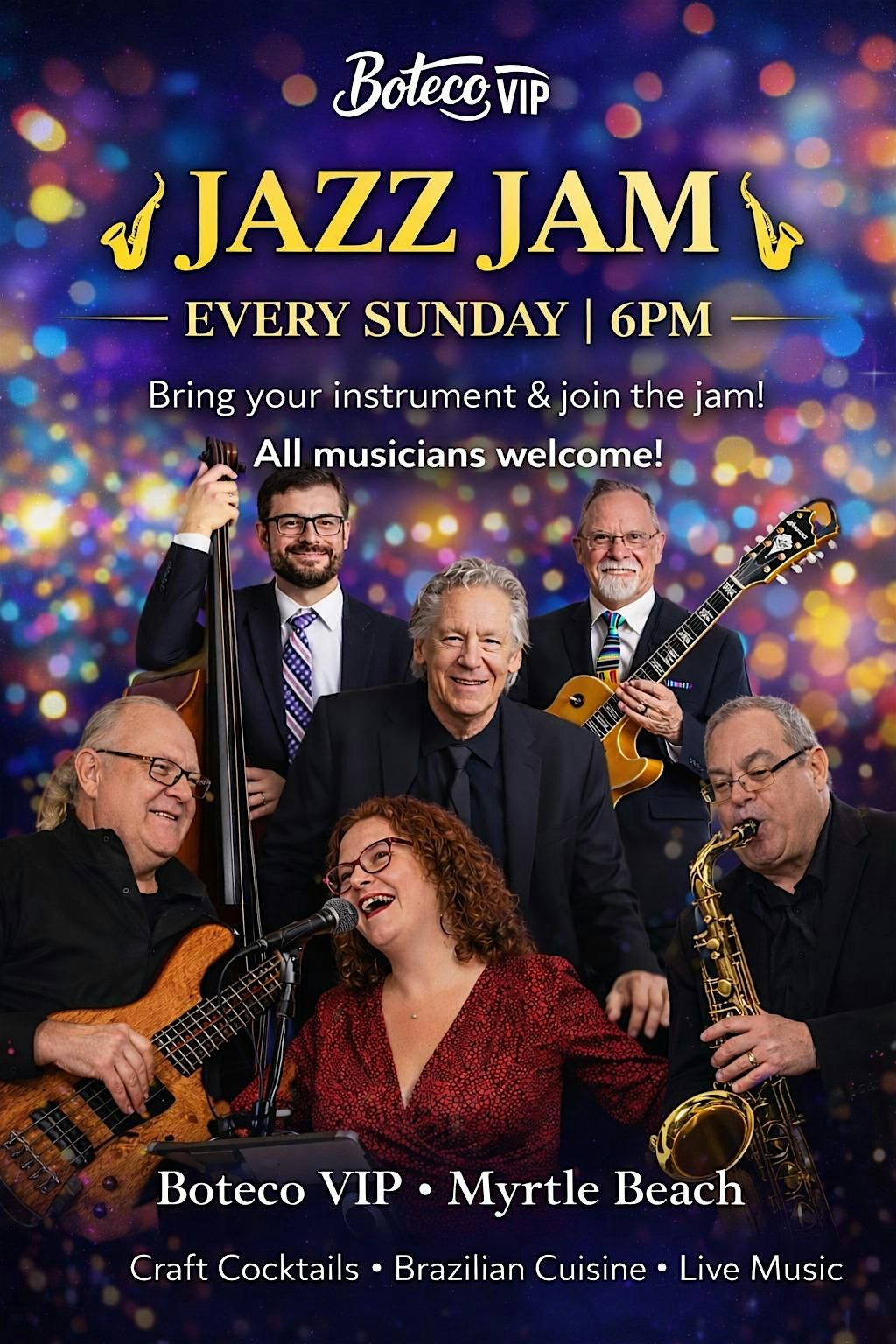 Sunday Jazz Jam at Boteco VIP 6PM. Musicians, vocalists & jazz lovers welcome. Great vibes, no drums. Join the groove!
