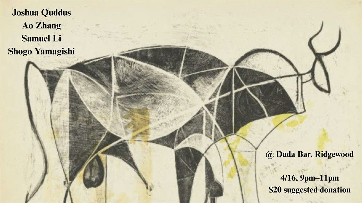 The Joshua Quddus Quartet—featuring Shogo Yamagishi on bass, Samuel Li on piano, Ao Zhang on drums, and Joshua Quddus on saxophone—presents an evening of original music influenced by the intersection of traditional, avant-garde, and modern jazz, shaped in part by Joshua’s ethnic background in Carnatic music. The group explores this blend through collaborative improvisation and compositions that move between structured forms and open musical dialogue.