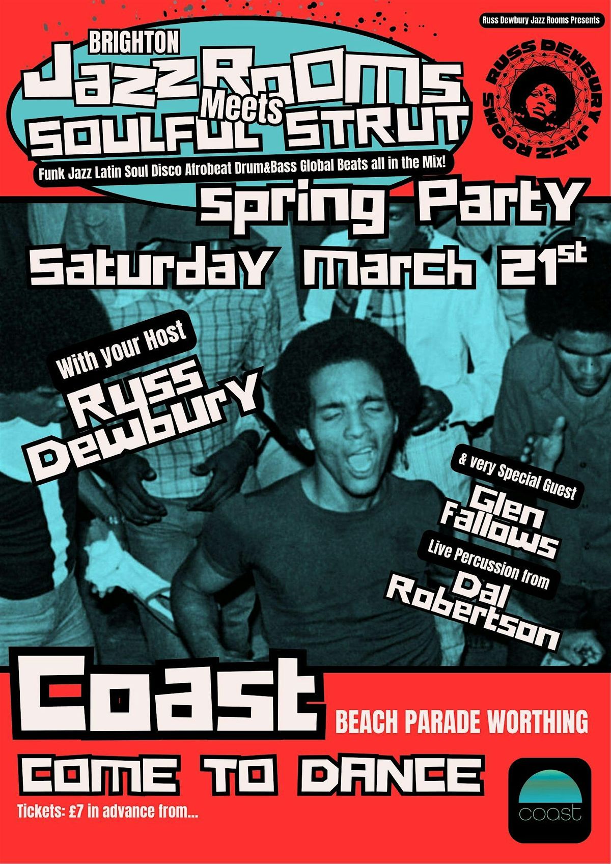 Hey Guys, it’s been a while and i'm delighted to be back with my annual Spring Dance Party at Coast, Worthing on Saturday March 21st. We’ve had some incredible party nights at Coast over the years! Packed out sessions with a busy dance floor and a super friendly crowd. Its become a favourite venue for me to play. Taking the essence from my 2 legendary and long running Brighton club residencies The Brighton "Jazz Rooms" and "Soulful Strut” nights at the Green Door Store I’ll be delivering another unforgettable night of music and vibes to light up Spring 2026. Funk/Jazz/Afro/Latin/Soul/Disco/Global Beats all in the mix. Longtime Worthing DJ legend Glenn Fallows (Mr Bongo) joins me on the decks and live percussion player Dal Robertson will be adding the dance floor heat. We’re running 8 - 1am and tickets are just £6. We look forward to welcoming you back for another great party right on the beach.See you on the dance floor X