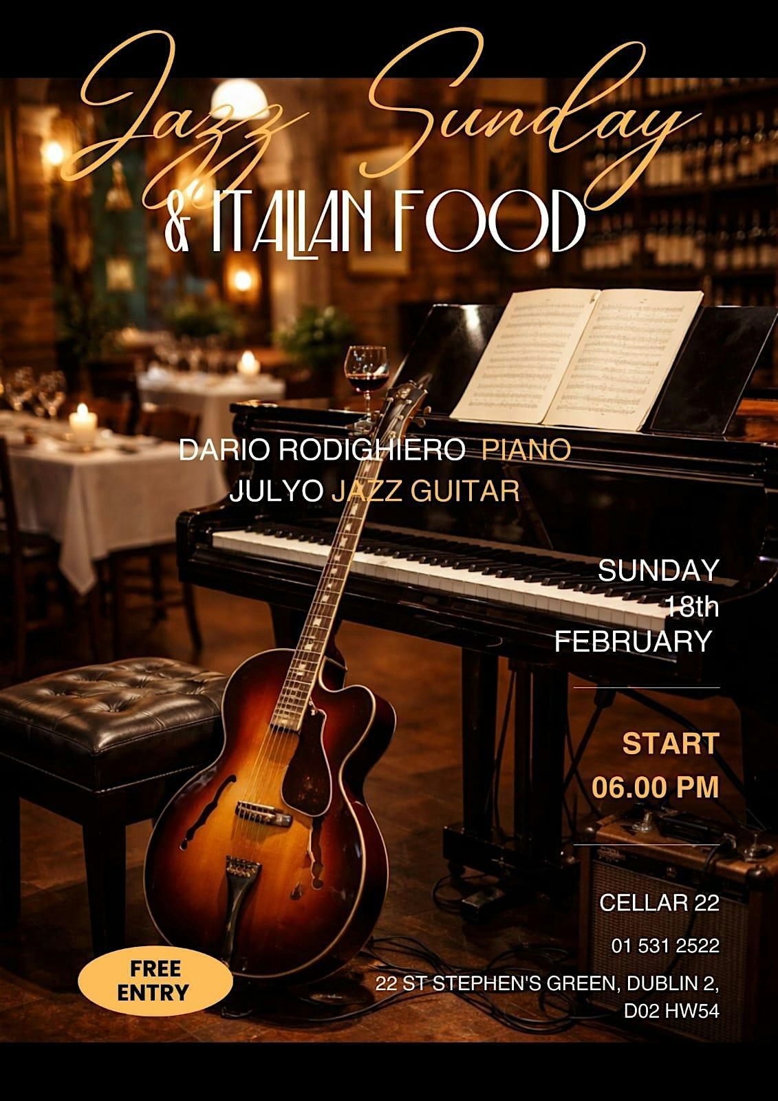Jazz piano and guitar with Dario Rodighiero and Julyo at Cellar22, excellent food and atmosphere, early evening in style.