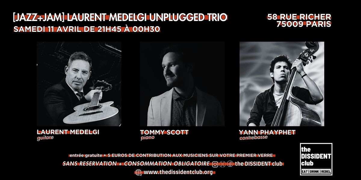 La guitare et les compositions de Laurent Medelgi accueillent le phénomène du piano Tommy Scott, venu tout droit d’Angleterre, ainsi que le contrebassiste groovy et globe-trotter Yann Phayphet. Pour une soirée haute en couleurs, dynamique et riche en émotions, des standards de swing et des compositions originales seront explorés. Une jam session ouverte aura lieu lors du dernier set.