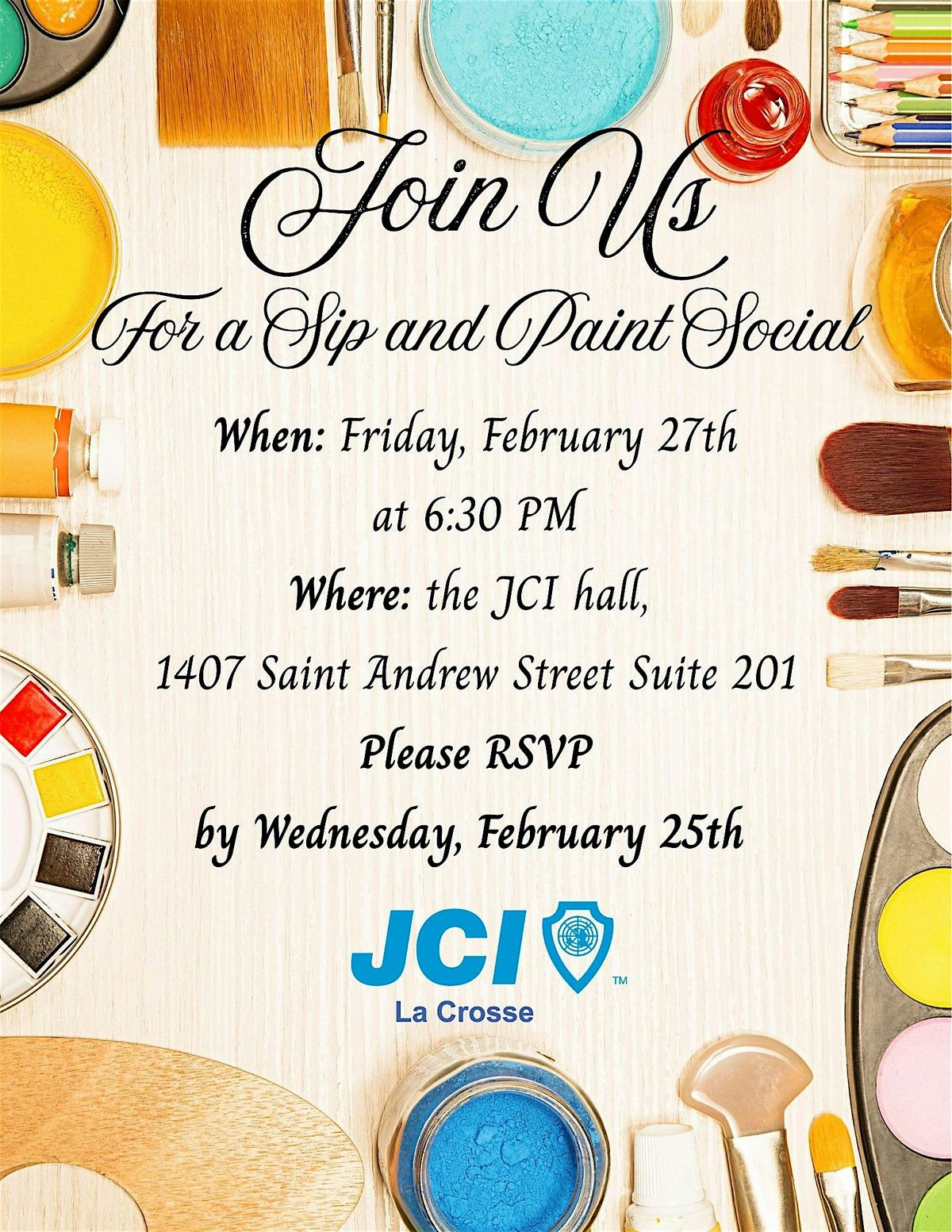 Looking for a fun night out? Join us for the JCI La Crosse Paint and Sip Social! It's an in-person event where you can unleash your creativity, enjoy some great company, learn about all the Jaycees do for the community and how to join all while siping on your favorite drinks. Whether you're a painting pro or just want to try something new, this social is the perfect way to relax and have fun. Don’t miss out on an evening filled with laughter, art, and good vibes!