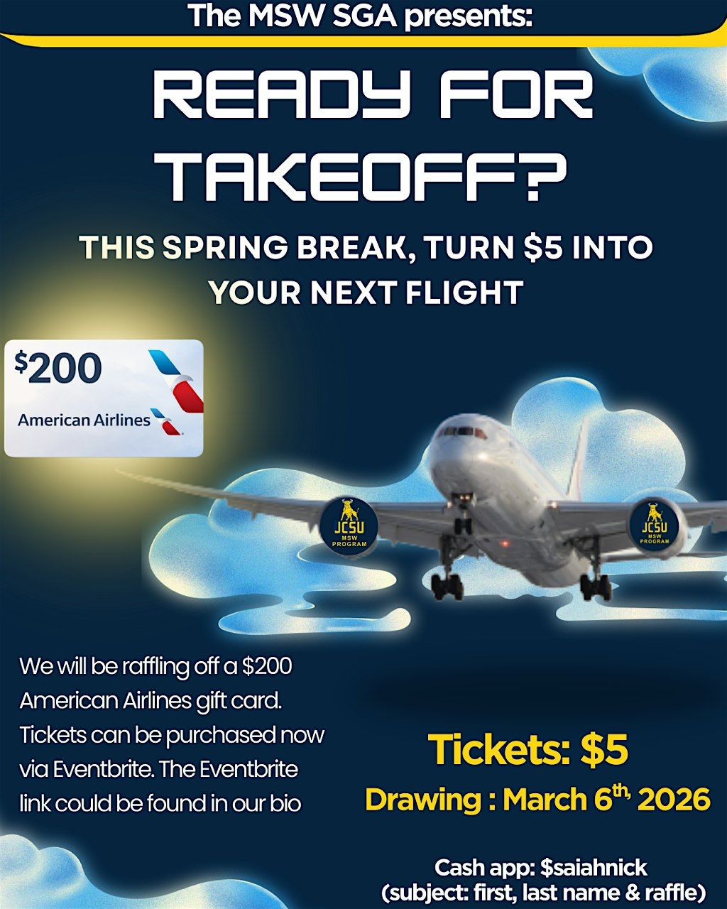 The JCSU Master Program will be raffling off a $200 American Airlines gift card. Tickets can be purchased between now in March 5th!
