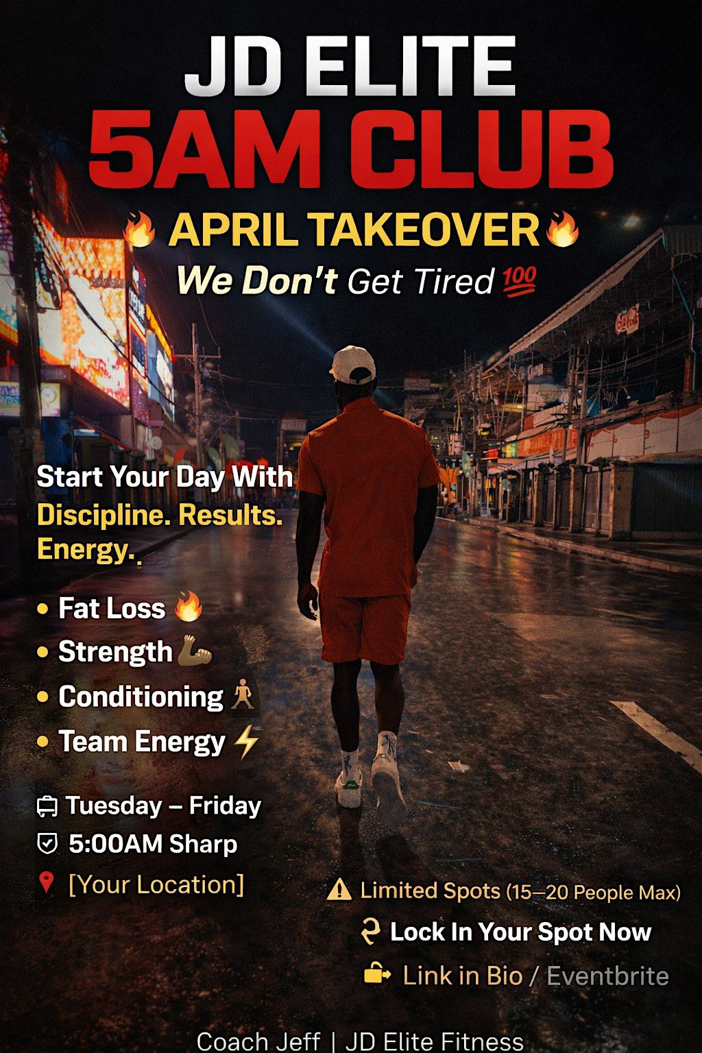 High-energy 5AM group training designed to burn fat, build strength, and lock in discipline. Limited spots — We Don’t Get Tired .”About this Event