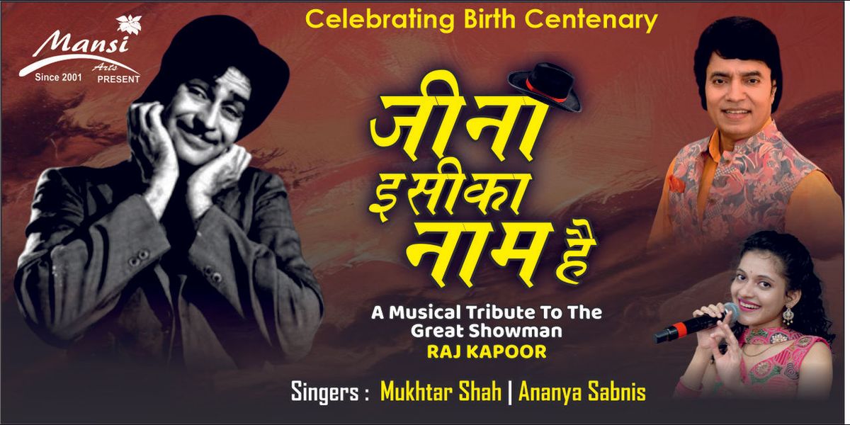 'Jeena Isi Ka Naam Hai’: A Tribute to the Great Showman on His Birth Centenary. Join us for a memorable evening celebrating the legacy of Raj Kapoor, the legendary actor and director, through his timeless songs.