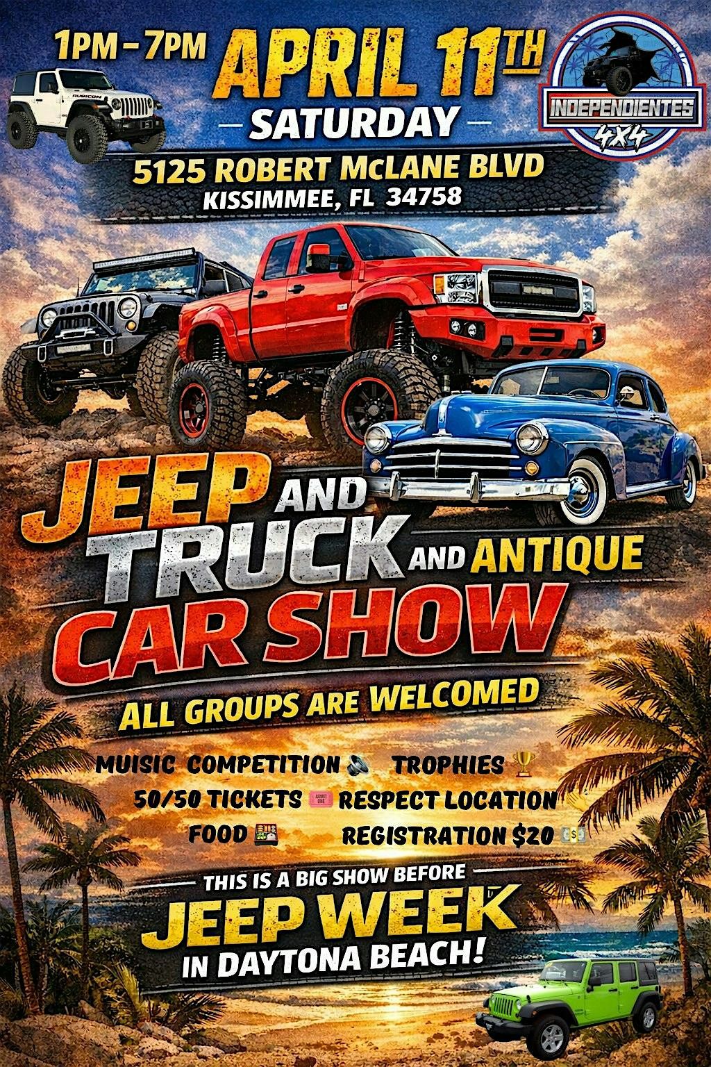 Come join us for an awesome in-person event featuring Jeep, trucks, and classic antique cars all in one place! 50 TROPHIES FOOD VENDORS MUSIC COMPETITION AND MORE!!