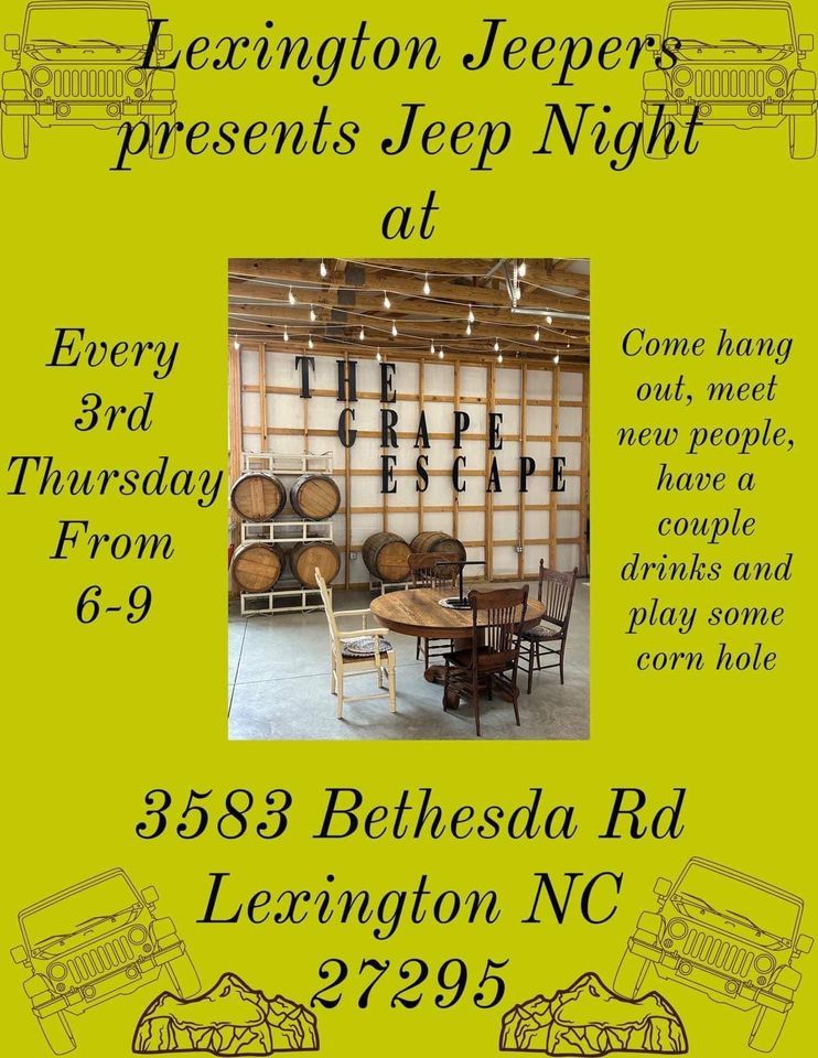 Join us every third Thursday of the month for Jeep Night hosted by Lexington Jeepers. Come meet new people, enjoy a wine slushy, and play Cornhole! We will be extending our business hours on these nights until 9 PM.