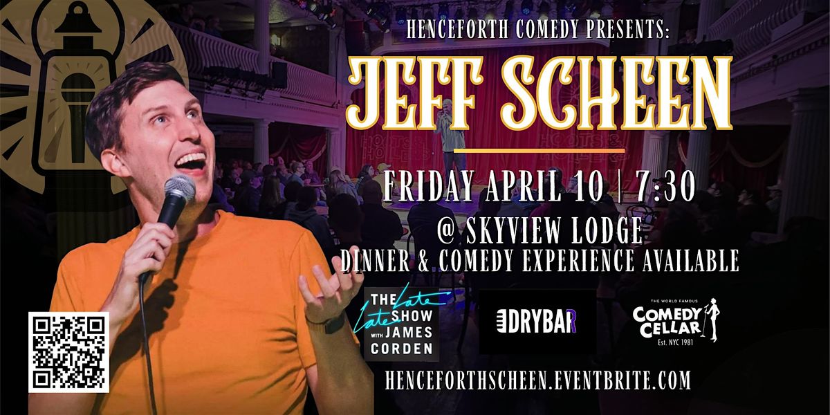 Henceforth Comedy (formerly Secret Society Comedy) brings a one-night pop-up comedy club experience to Skyview Lodge — featuring nationally touring headliner Jeff Scheen, known for The Late Late Show with James Corden, Drybar Comedy, and regular appearances at New York’s legendary Comedy Cellar.