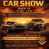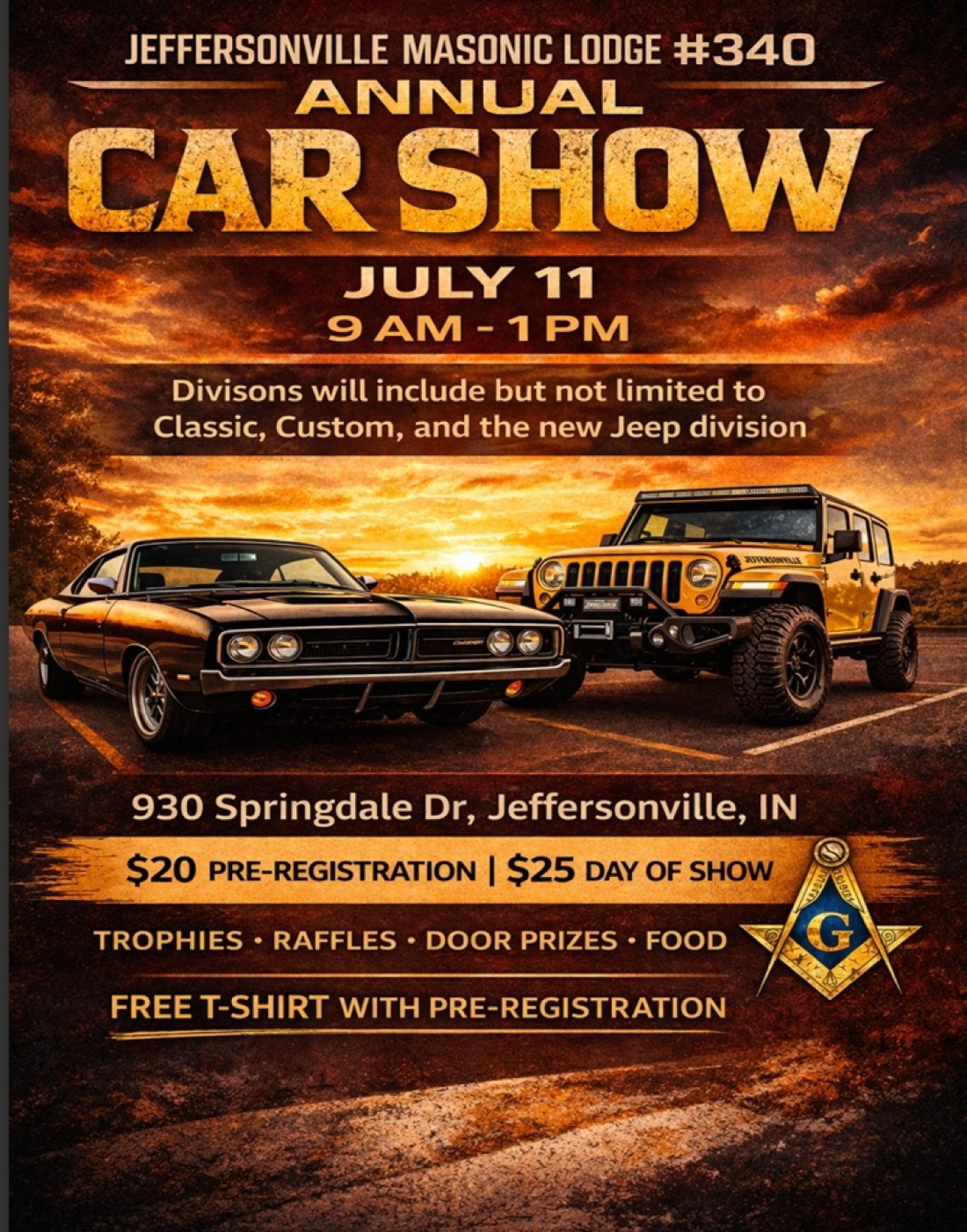 Rev up your engines and join us for a great day at the Jeffersonville 340 Masonic Lodge Car Show. Classic cars, hot rods, modern builds, and everything in between will be on display for enthusiasts and families alike. Enjoy a relaxed atmosphere, good company, and plenty of eye‑catching rides. Whether you’re showing a vehicle or just stopping by to admire the lineup, everyone is welcome.