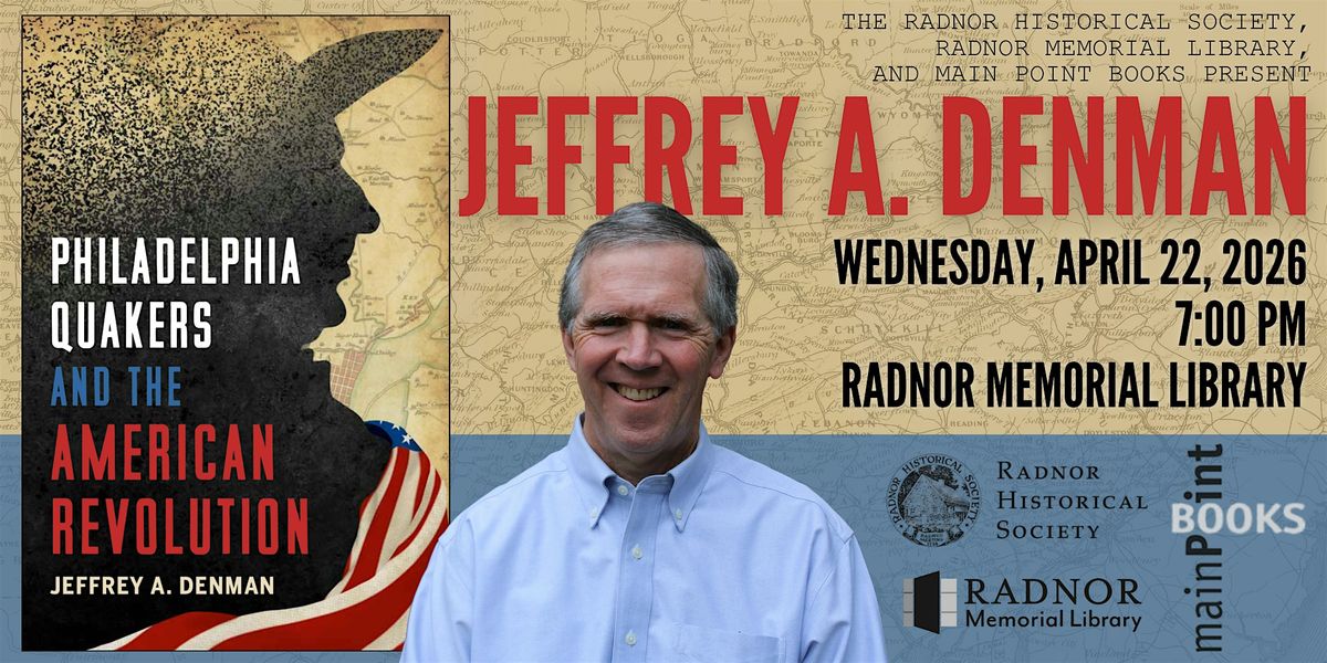 Main Point Books, Radnor Memorial Library and Radnor Historical Society invite to an evening of Philadephia history with author Jeffrey A. Denman. "Philadelphia Quakers and the American Revolution" vividly describes the precipitous rise of the Philadelphia Quakers and their fall during the American Revolution.