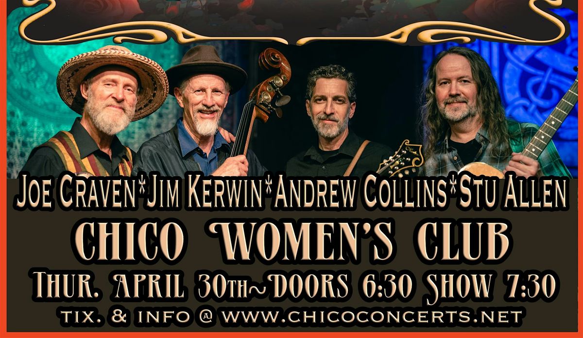 Garcia passed away in 1995, and Grisman rarely tours these days; but the music lives on with the original rhythm section of Joe Craven and Jim Kerwin, and Stu Allen on acoustic guitar and vocals, and either Ronnie McCoury or Andrew Collins on mandolin. Jerry & Dawg Revisited is reintroducing that original sound and songs to new and old generations alike, with guest artists who bring the passion and virtuosity of Jerry and Dawg to the live stage!