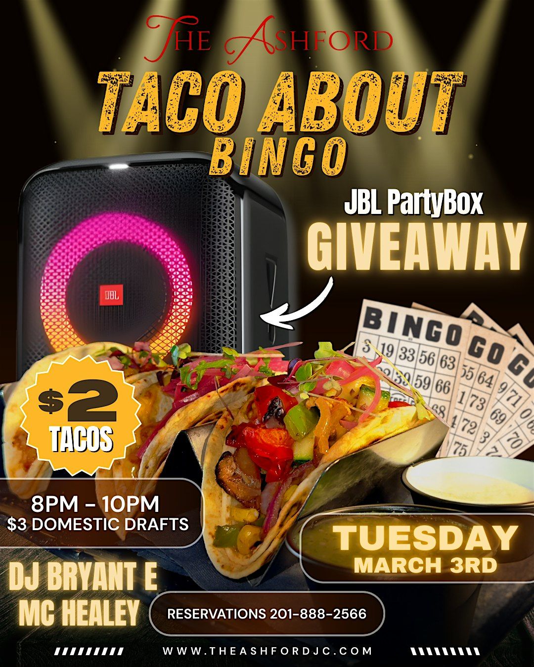 Get ready for a high-energy night at The Ashford featuring tacos, bingo, drinks, music, and a HUGE giveaway 🎉