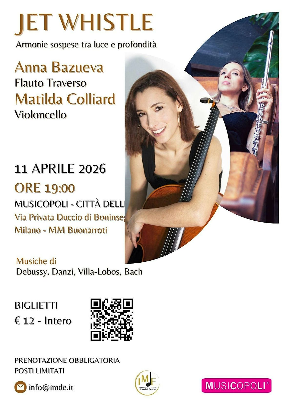 Un dialogo sonoro raffinato e sorprendente tra flauto e violoncello prende vita con Jet Whistle, il concerto che vedrà protagoniste Anna Bazueva (flauto traverso) e Matilda Colliard (violoncello), sabato 11 aprile 2026 alle ore 19:00 presso Musicopoli – Città delle Arti a Milano.