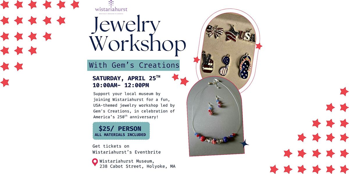 ¡Apoya a tu museo local participando en Wistariahurst en un divertido taller de joyería con temática estadounidense, impartido por Gem's Creations, para celebrar el 250 aniversario de Estados Unidos! Durante este taller, crearás tus propias piezas de joyería para llevártelas a casa y disfrutarlas. El precio de la entrada incluye todos los materiales del taller. ¡Únete a esta divertida mañana llena de abalorios y joyas!