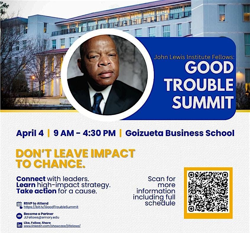 On Saturday, April 4, 2026, the John Lewis Institute Fellowship will host the inaugural Good Trouble Summit at Goizueta Business School. This one-day, student-led convening brings together 100+ students, alumni, community members, and civic leaders from across sectors to answer John Lewis’s call to make “good trouble, necessary trouble.”