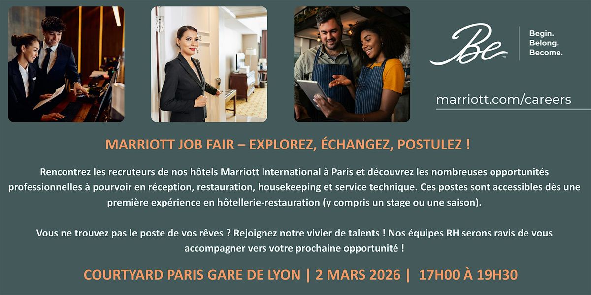 Rencontrez les recruteurs de nos hôtels Marriott International à Paris et découvrez les nombreuses opportunités professionnelles à pourvoir en réception, restauration, housekeeping et service technique.