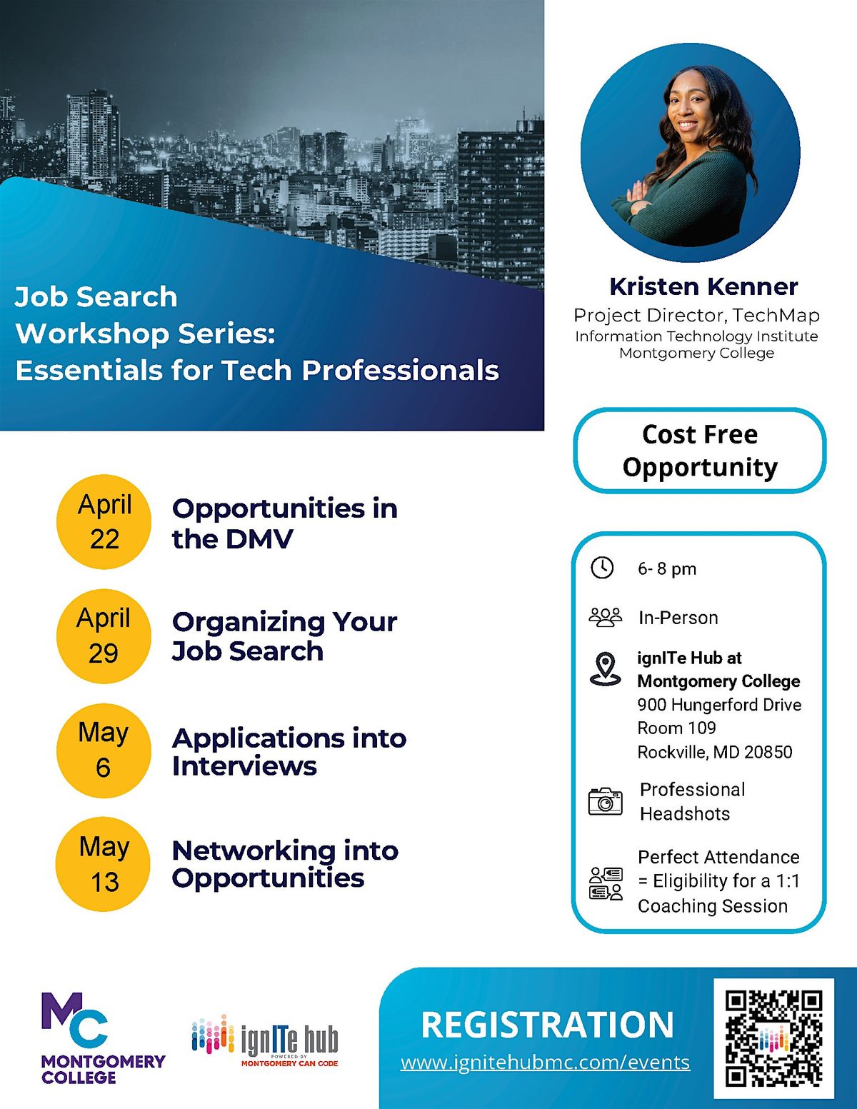 This 4-part workshop series is designed to empower you with knowledge and skills to navigate the DMV job market effectively and efficiently. Students will learn about what's working and not working in today's competitive job market, how to stay organized in their job search, and how to land interviews.