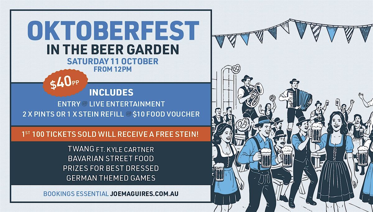 Welcome to Joe Maguires Oktoberfest! Get ready for a day filled with fun, music, and of course, plenty of beer! Join us at Joe Maguires for a traditional Oktoberfest celebration. Put on your lederhosen and dirndls and come enjoy authentic German street food, live music, and games. Prost! Don't miss out on this exciting event - grab your friends and family and join us for a day of festivities. Included in your ticket price is entry into the event, live music from Twang ft Kyle Catner, 2x pints or 1x stein refill and a $10 food voucher! There will also be prizes for best dressed. See you there!