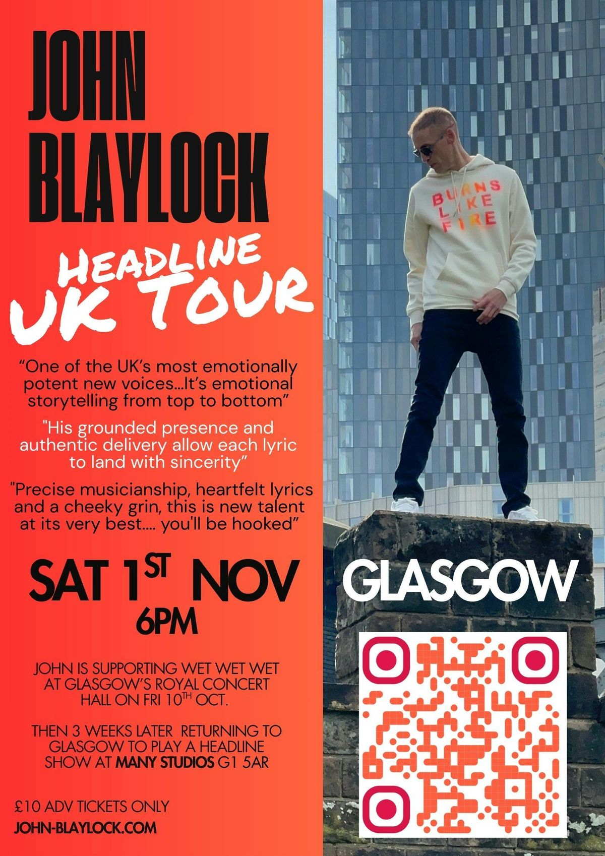 John Blaylock is an emerging singer songwriter from Manchester. Supporting Wet Wet Wet on their UK tour and then returning to the same cities for a headline tour a few weeks laterAfter supporting Wet Wet Wet at Glasgow's Royal Concert Hall on 10th October John returns to Glasgow for a headline show at Many Studios on Sat 1st Nov 5.30pm