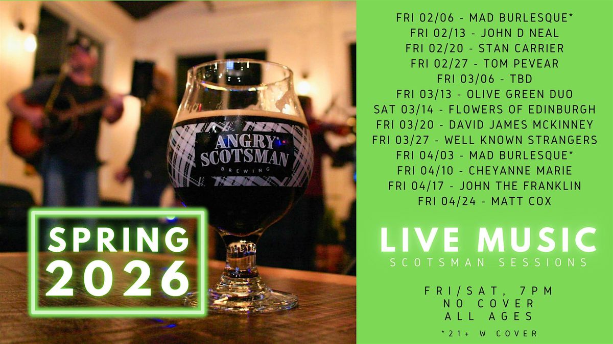 Live music at Angry Scotsman is always free cover and free parking. All ages welcome (under 21 with guardian). Performances are indoors on the stage, or outside on the patio weather permitting.