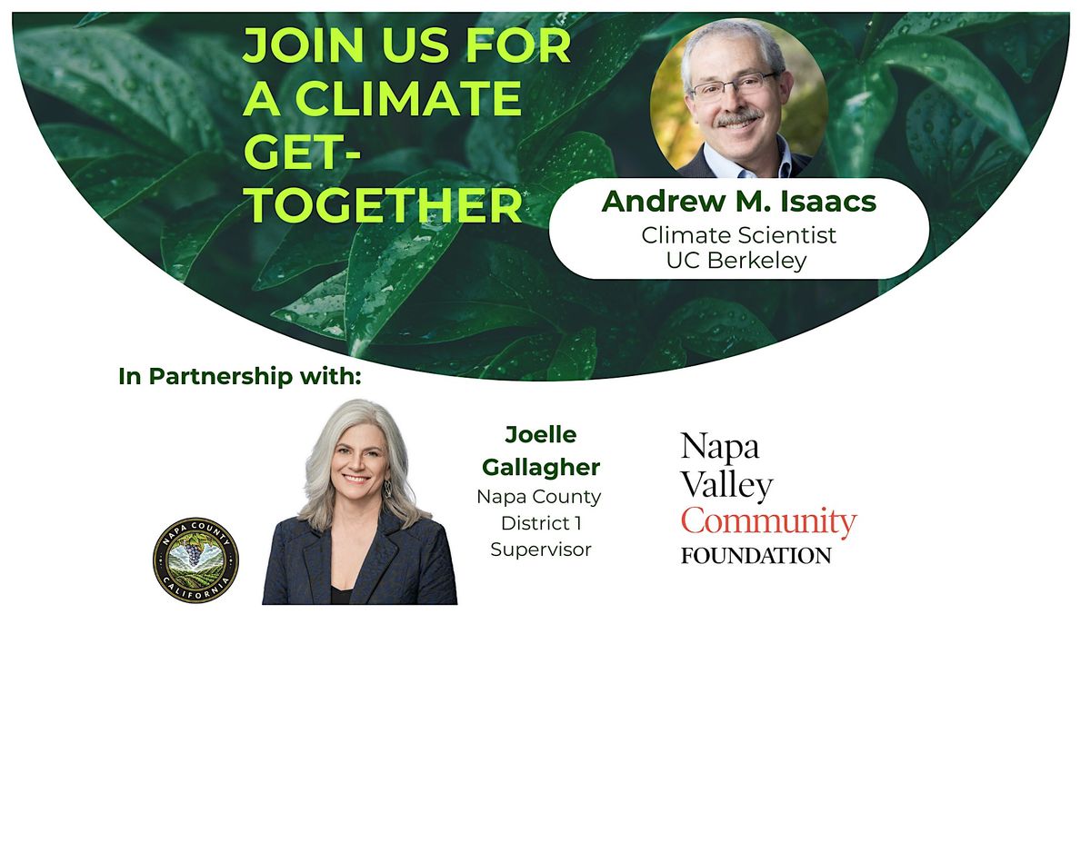 Napa County District 1 Supervisor Joelle Gallagher and the Napa Valley Community Foundation are teaming up with Andrew M. Isaacs for a “Climate Get-Together” — a lively, down-to-earth conversation about our changing climate and what it means for our lives, our community, and our future.