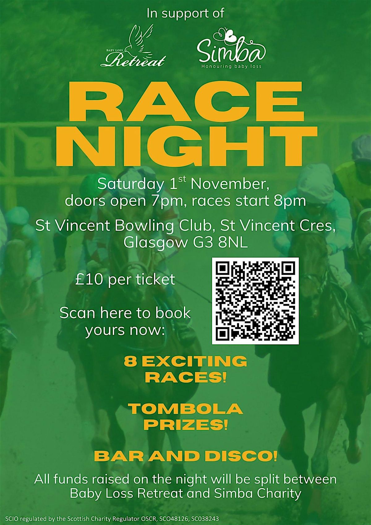 Baby Loss Retreat and Simba Charity are delighted to be hosting our first joint race night at the St Vincent Bowling Club, Glasgow. A fun night of racing, Games, Tombola and disco afterwards. All money made on the night will be split 50/50 between the 2 great charities who help parents at any stage after the loss of a baby.
