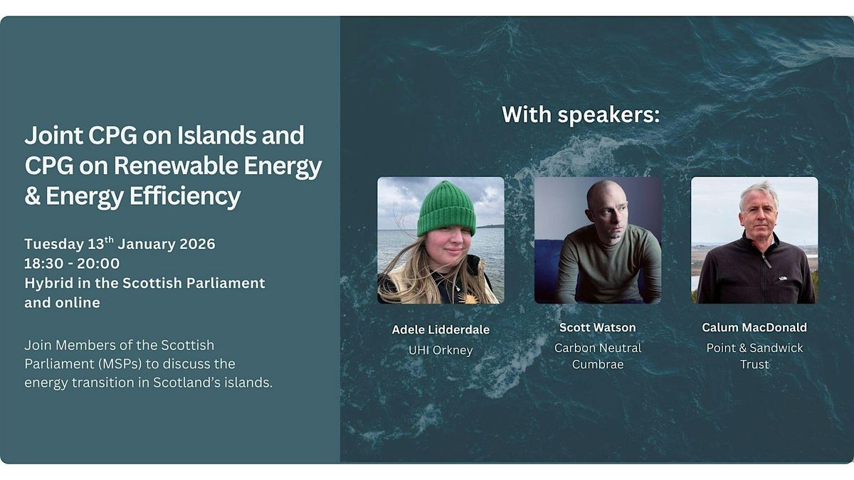 The Cross Party Group on Islands in the Scottish Parliament (CPG Islands) and the Cross Party Group on Renewable Energy & Energy Efficiency in the Scottish Parliament (SPREEE) have joined forces for a special HYBRID meeting focused on the challenges and opportunities relating to the energy transition in Scotland's islands.
