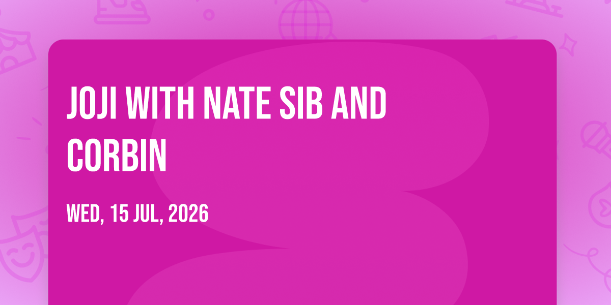 📍 Location: 37.768, -122.388🎉 Welcome to Joji with Nate Sib and Corbin, where the impossible becomes possible and dreams take flight! 🏛️ Join us at Chase Center in the heart of San Francisco, CA for an event that will redefine your expectations. 📅 On July 15th, 2026 at 01:30 AM, witness the transformation of space and time into something truly magical. ✨ It's a curated experience combining the best of innovation, entertainment, and community spirit, creating moments that will be remembered for years to come. Whether you're a first-time visitor or a seasoned enthusiast, prepare to be amazed. 🎊 Book now to ensure your place in this unforgettable experience!