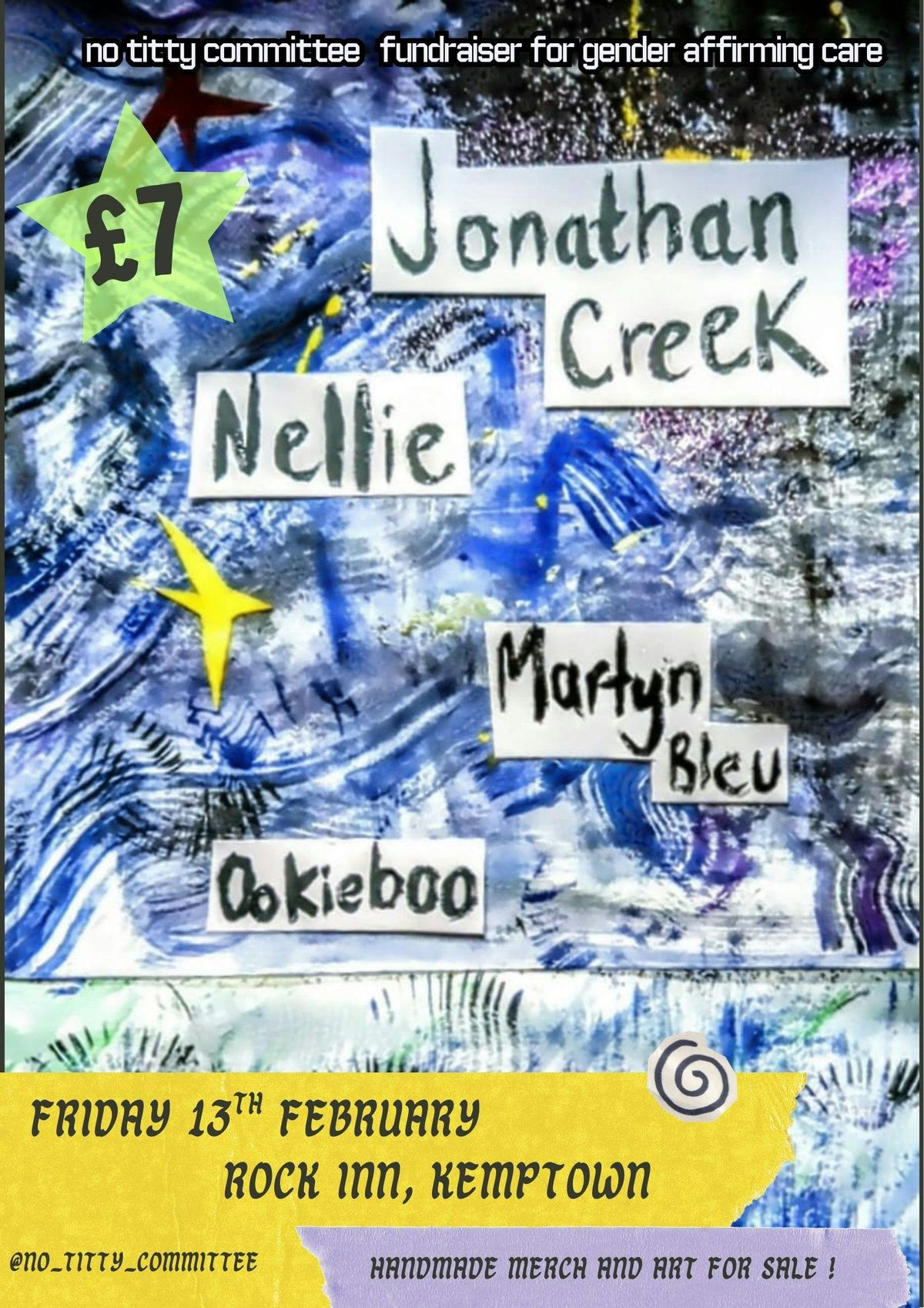 Rock out @ Rock Inn Friday 13th February !!! One bus to Rock Street please. Jonathan Creek - Nice good wholesome sad from London/Brighton. Soft sweet words and twinkly guitar that make your heart ache good. Nellie - Welcome to Nellie's haunting theatre. Expect structures that mislead, jazzy undertones, spoken word and warped time. You may feel slightly unsettled upon exiting the theatre…whilst longing to return. Martyn Bleu - Slow, fuzzed out funeral lullabies to carry you asunderOokiboo - Lucas Judd is a singer songwriter based in Brighton. His performances are bold and experimental with lots of energy like a rabbit trapped in a shoebox. Lots of scratching and disturbing noise that eventually turn nice. His favourite colour is green and he loves monkeys. Disclaimer: