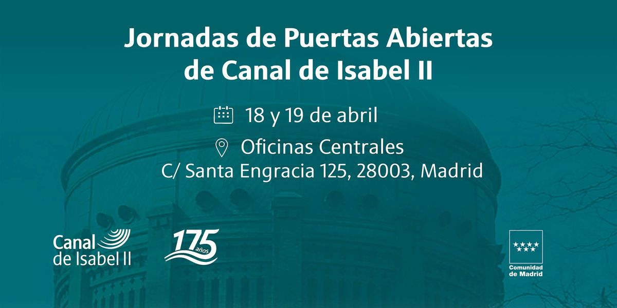 Con motivo del 175 aniversario, abriremos al público sus oficinas centrales para ofrecer unas Jornadas de Puertas Abiertas a las instalaciones históricas ubicadas en el entorno de la calle Santa Engracia 125 el sábado 18 y el domingo 19 de abril con el objetivo de acercar a los ciudadanos el patrimonio hidráulico que forma parte de la historia del abastecimiento de agua en la Comunidad de Madrid.