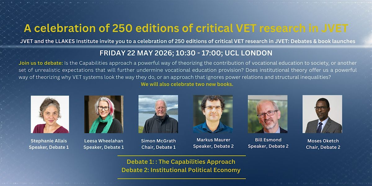 To celebrate the 250th edition of the Journal of Vocational Education and Training, we invite you to participate in a debate on two key theoretical traditions influential in vocational education and training research, followed by the launch of two new books.